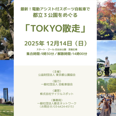 冬の光がやわらかく降りそそぐTOKYO。 自転車で、都立3公園【日比谷公園・芝公園・青山公園】をのんびりとめぐる「散走(さんそう)」へ出かけてみませんか?風を感じながらこぐペダル、立ち寄った公園でひと休み。 ゆっくりと流れる時間の中で、街と季節を感じる散走です。