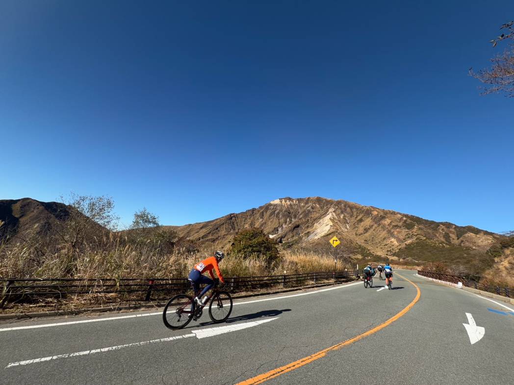2日目はファイライド形式で実施され、ルールとマナーを守りながら阿蘇のダイナミックな風景を楽しみながら、小春日和の温かい天候の中、気持ちの良い汗をかきました。65㎞という距離にもかかわらず、アップダウンが豊富なレイアウト。1000m以上の獲得標高で走りごたえも抜群。「この上り坂、聞いてないよ~」と苦笑いをしながら走る参加者も。でも内心は楽しんでいるのがわかります。