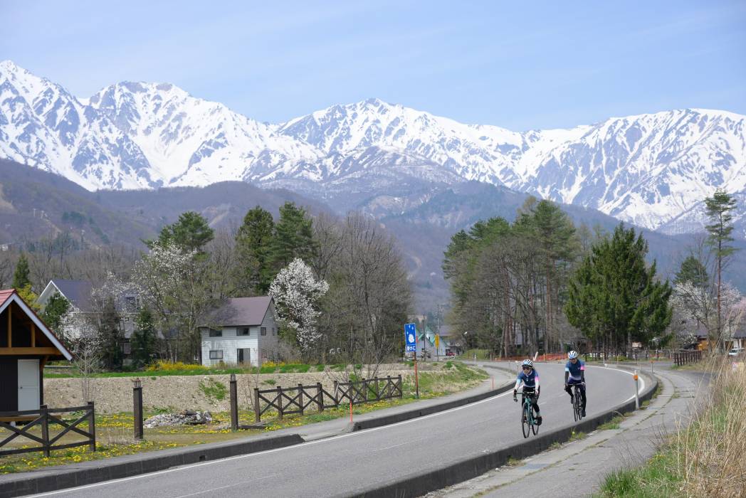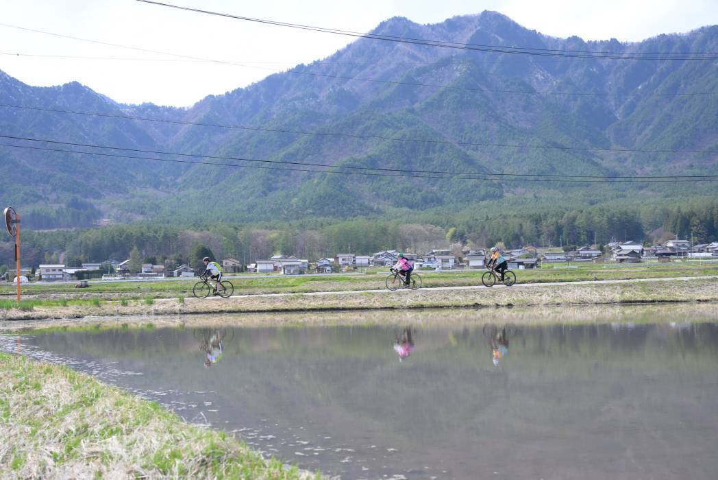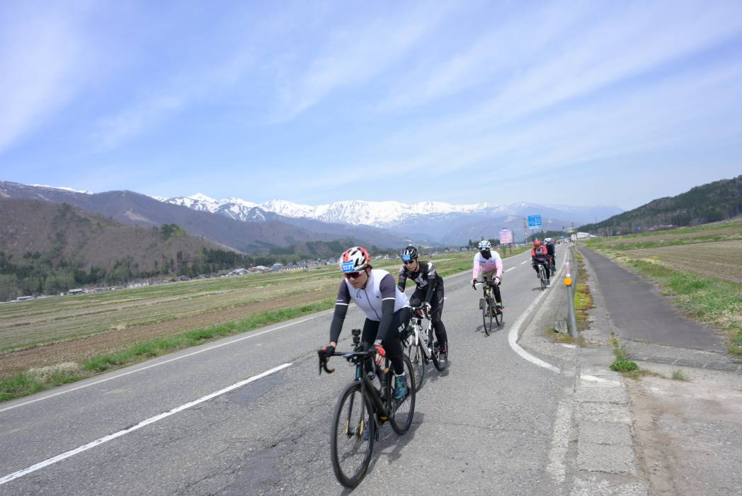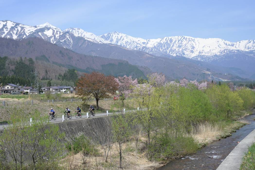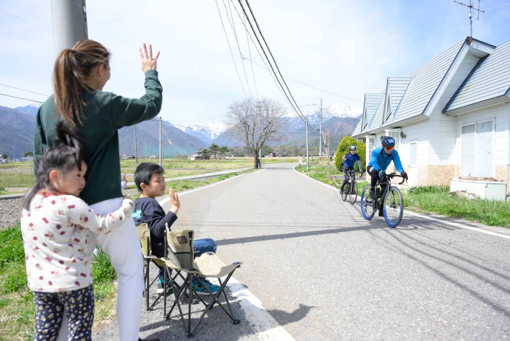信号が少なく、リズムよく進める道。安曇野らしい田園風景と清流、遠くに見える北アルプスの峰々。AACRの魅力は、単に長い距離を走ることではありません。この土地の春を、風の匂いも、路面の感触も、沿道の空気も含めて、丸ごと味わっていただけることにあります。