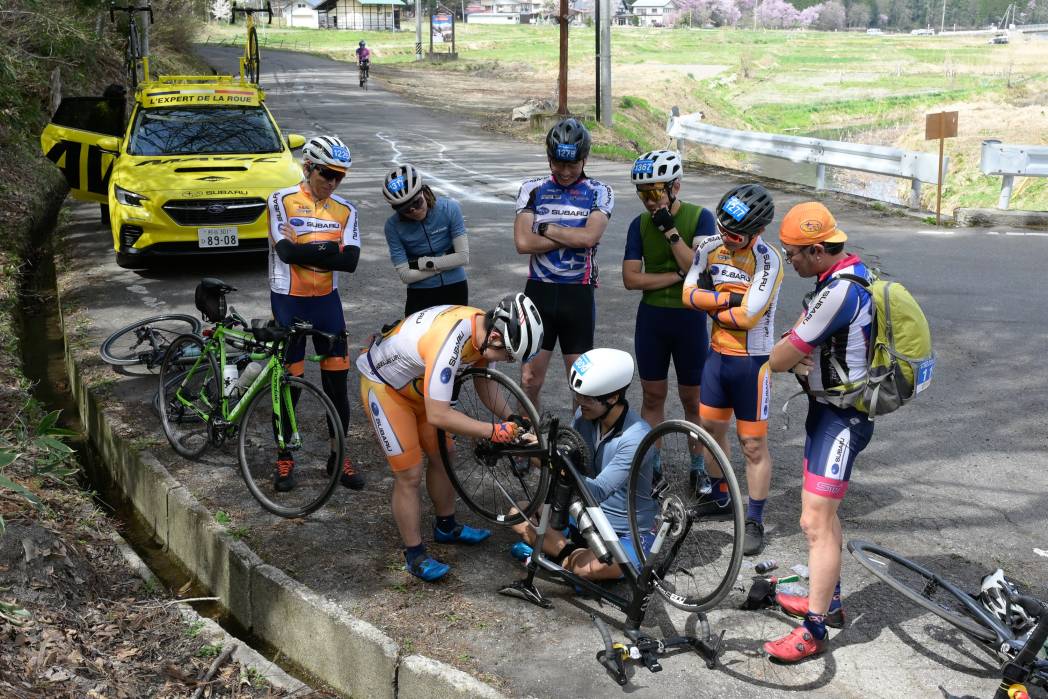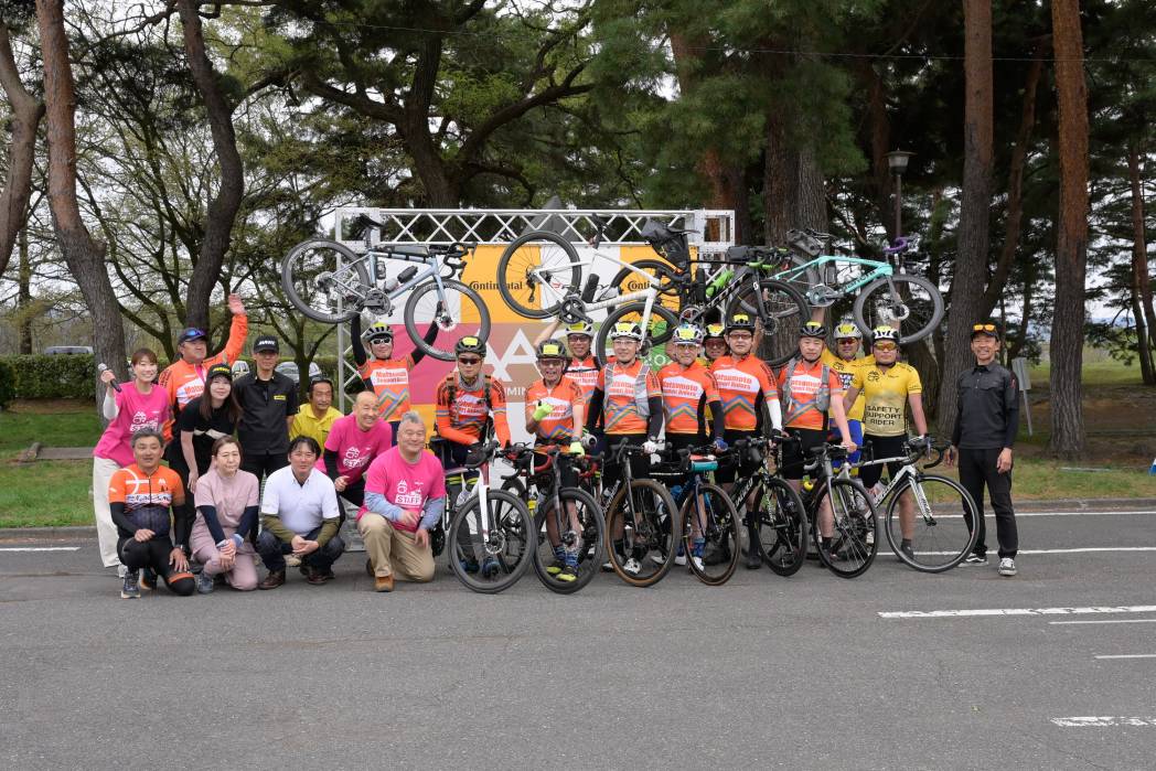 松本サポートライダーズ(オレンジジャージ)、セーフティーサポートライダーズ(イエロージャージ)、MAVICサポートチーム、医療チーム、元サポートチームなど皆さんと。