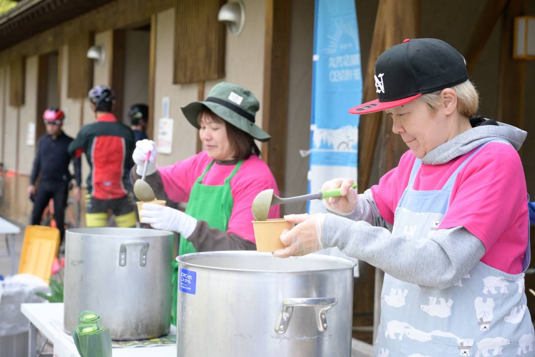 ボランティアによるスープの振る舞い 穂高エイドはチューリップが満開