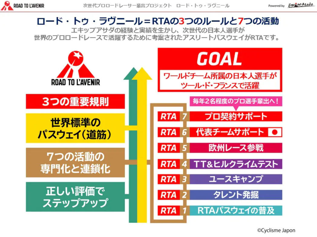 RTAは次世代プロロードレーサーの輩出を目的に、7段階の活動を設定している。1〜4段階が国内、5〜7段階が欧州での取り組みだ。