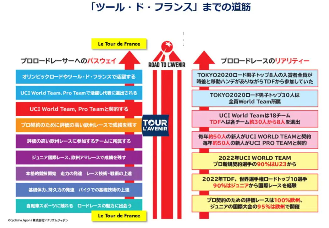 5段階目の「欧州レース参戦」では、2025年に春と夏の遠征で年間約100日、30レースに参戦。浅田氏は「ヨーロッパのレースで認められない限りプロにはなれない」と断言する。現在、ワールドチームの育成チームはU23の1年目から選手獲得に動いており、ジュニア期から実績を出すことが求められている。